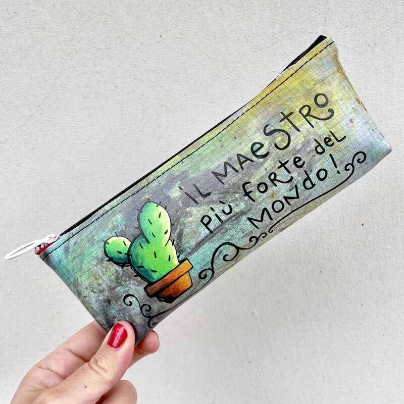 Astucci in ecopelle per insegnanti con varie illustrazioni.