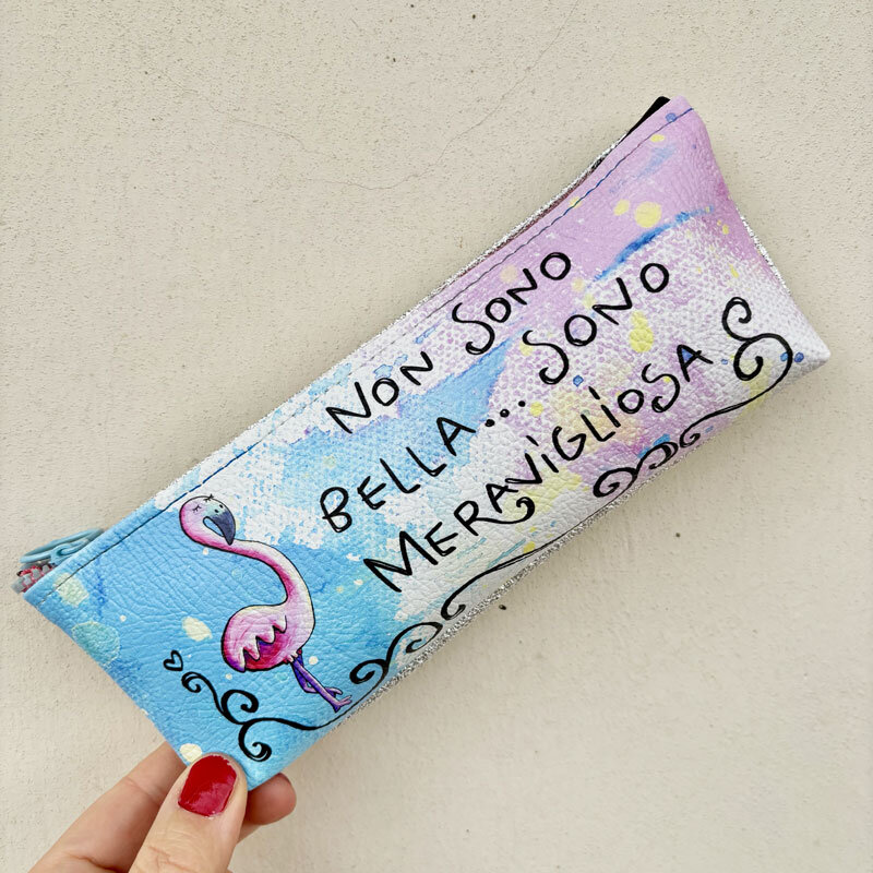 Astuccio in ecopelle con fenicottero e scritta, zip per la chiusura, cucito a mano.