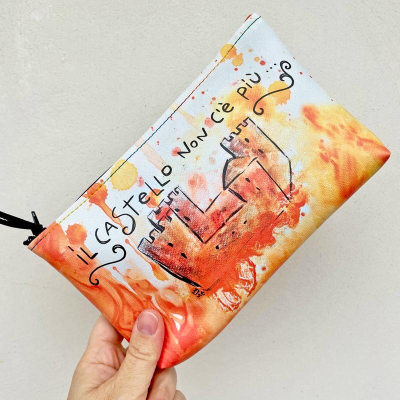 Bustina in ecopelle a tema Carnevale di Ivrea con castello e scritta, zip per la chiusura, cucita a mano.