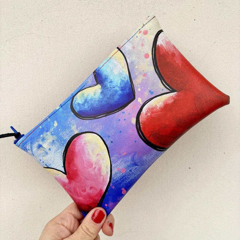 Bustina in ecopelle con cuori, zip per la chiusura, cucita a mano.