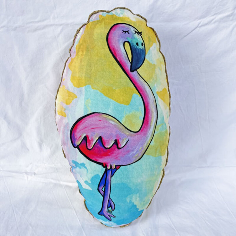 Cuscino ovale con fenicottero, bordino dorato e retro arlecchino, stampato su cotone e cucito a mano da Martedìmattina.