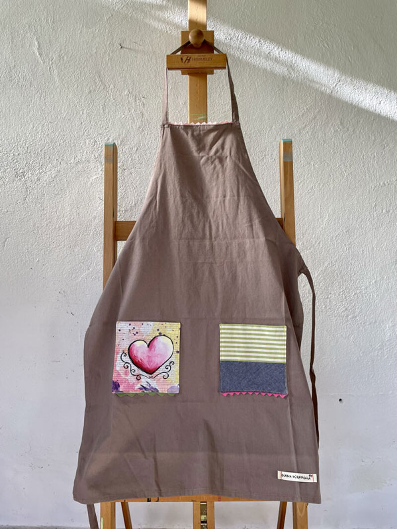 Grembiule tortora con due tasche: una con stampa con cuore e l'altra realizzata patchwork con stoffe di riuso, cucite a mano da Martedìmattina.