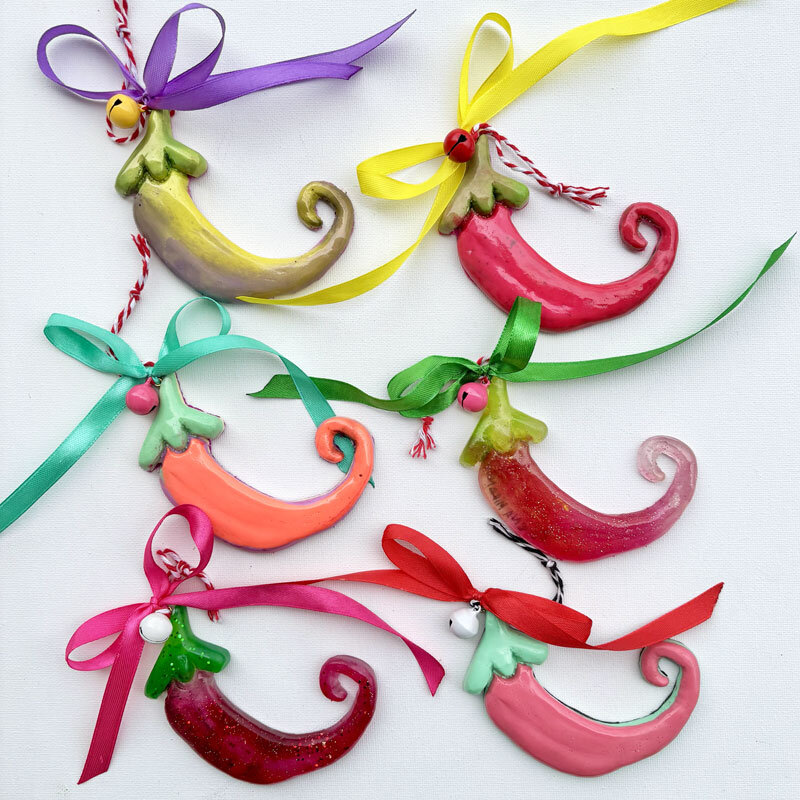 Palline di natale a forma di peperoncino realizzate in resina, con nastrino in raso e campanellino. Dimensione circa 10x8cm. Da appendere al tuo albero di Natale oppure tutto l'anno dove vuoi tu!