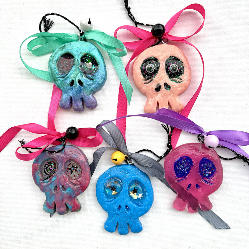 Palline di natale a forma di teschio realizzate in resina e dipinte a mano, con nastrino in raso e campanellino. Dimensione circa 6cm. Da appendere al tuo albero di Natale oppure tutto l'anno dove vuoi tu!