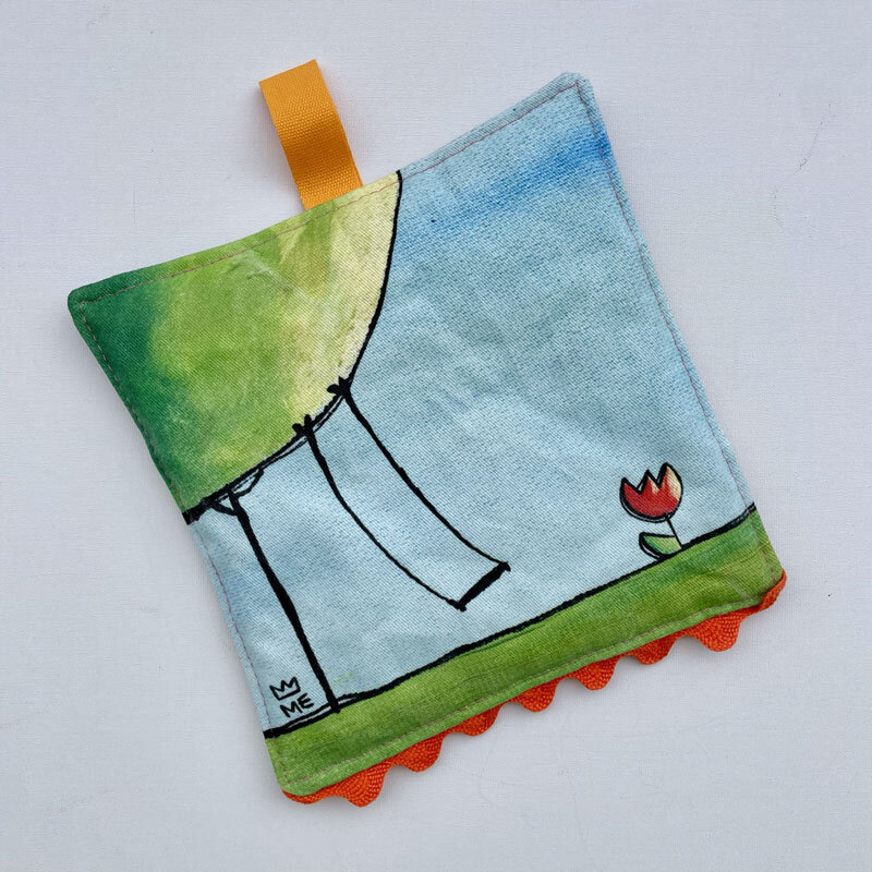 Presina con albero e altalena, con fettuccia per appenderla, bordino e retro patchwork, stampata su cotone e cucita a mano da Martedìmattina.