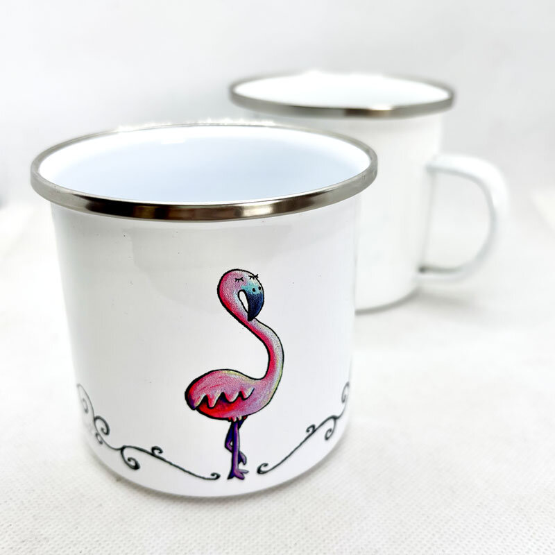 Tazza in metallo stile vintage con bordino argento e fenicottero, stampata in sublimazione.