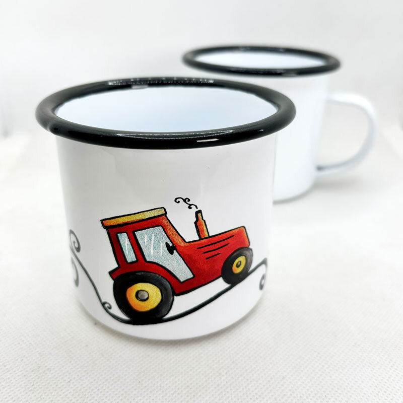 Tazza in metallo stile vintage con bordino nero e trattore, stampata in sublimazione.