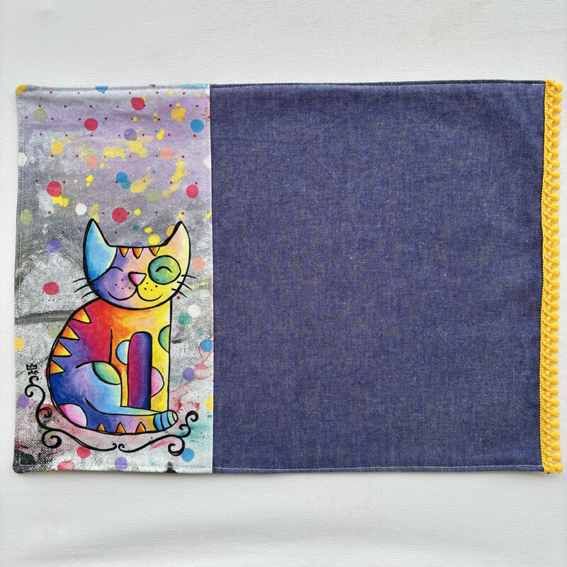 Tovaglietta con gatto, stampata su cotone e cucita a mano con tessuto denim e bordino colorato da Martedìmattina.