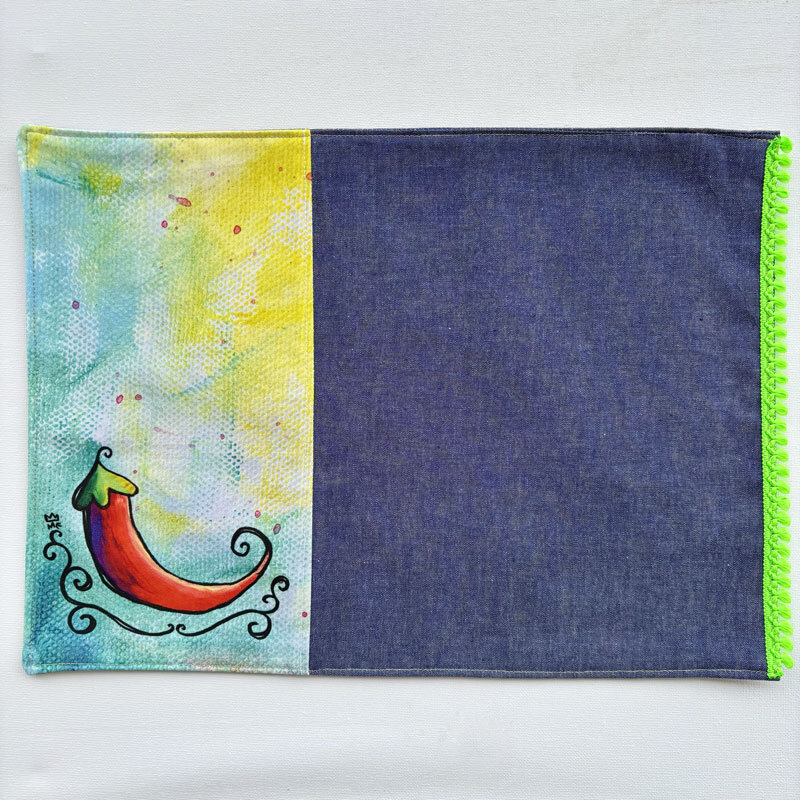 Tovaglietta con peperoncino, stampata su cotone e cucita a mano con tessuto denim e bordino colorato da Martedìmattina.