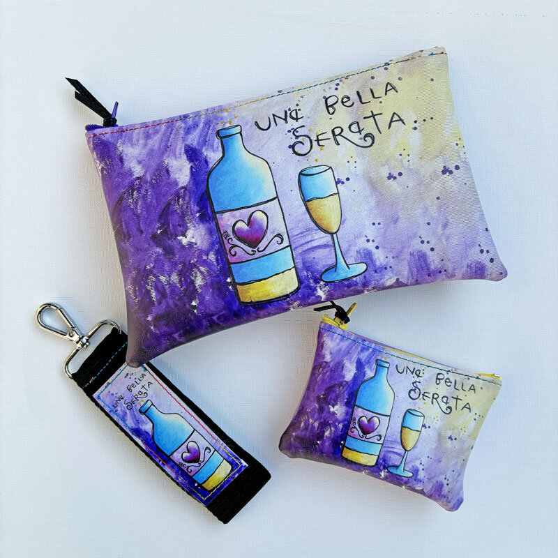 Accessori cuciti a mano in ecopelle a tema vino e scritta Una bella serata: